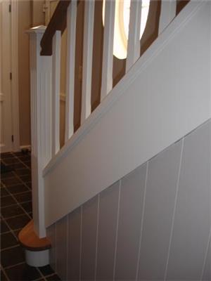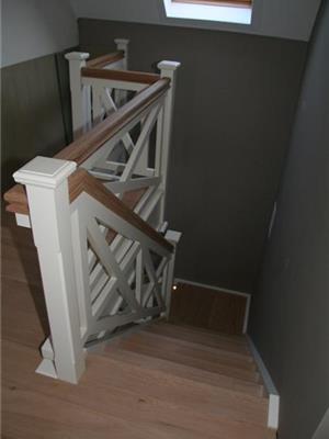 De witte lak zorgt voor een strak design. U kan die strakke look doortrekken in een leuning met rechte balusters, maar bij een cottage trap kiezen mensen ook vaak voor een leuning met kruizen.